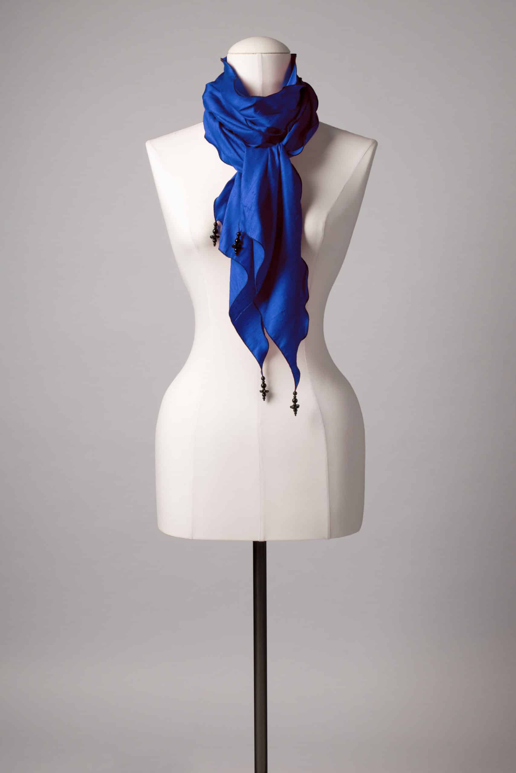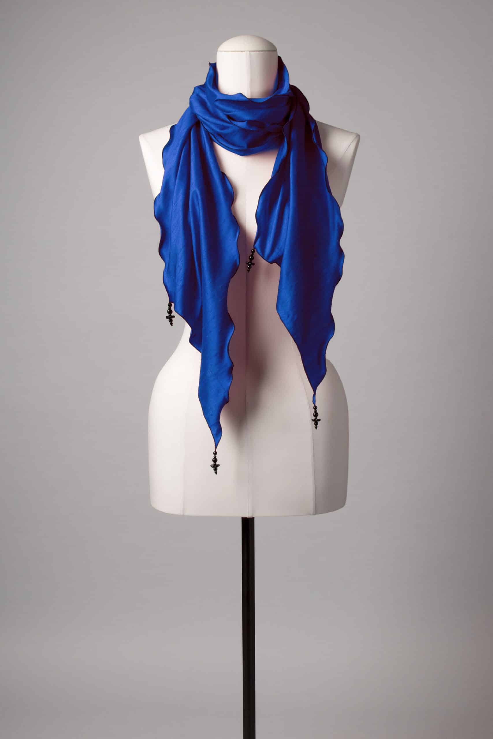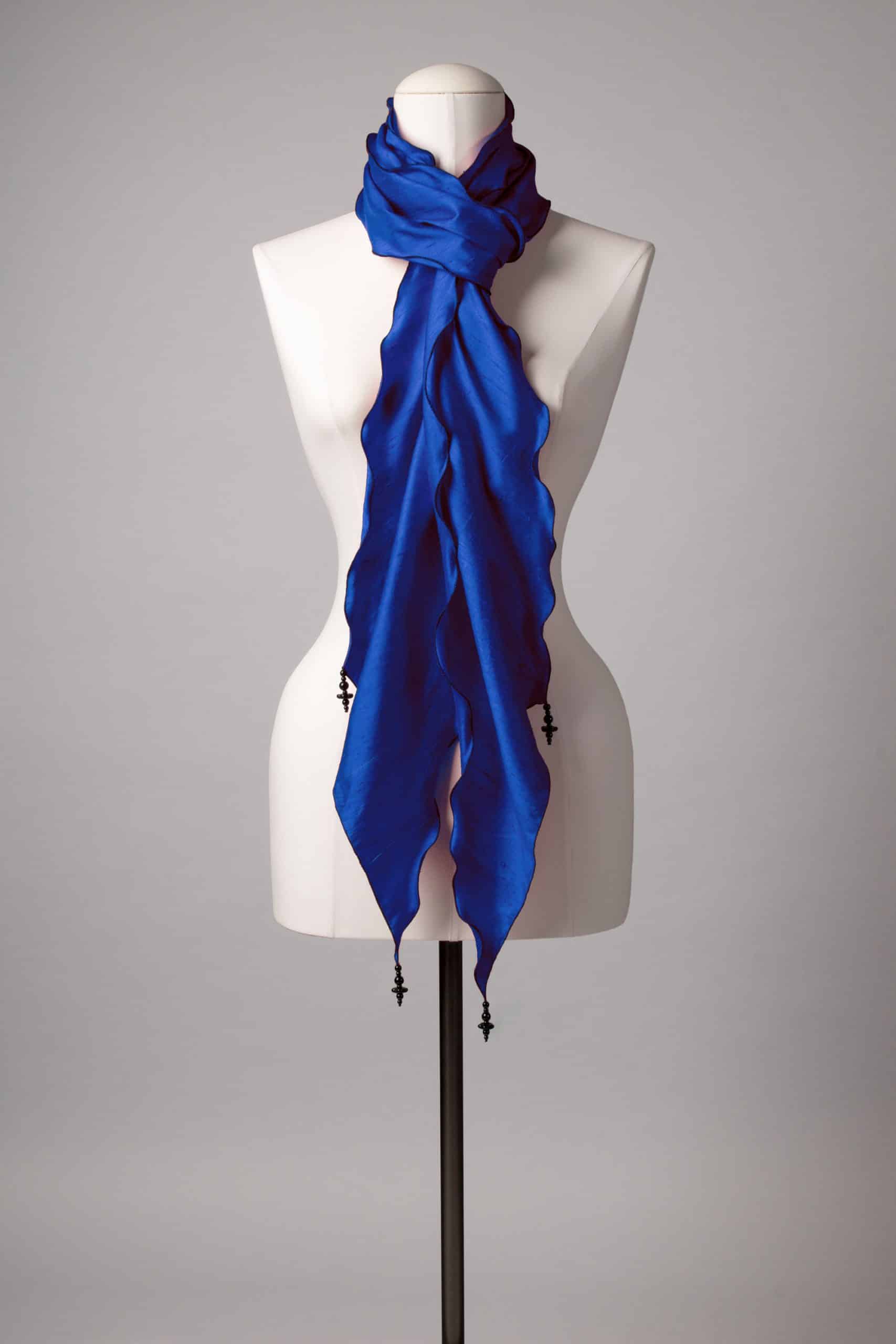 Der Wildseide-Schal “Blue Wild Waves” ist ein ganz besonderer Hingucker. Durch eine spezielle Fertigungsweise entstehen die wellenförmige Kante und der diagonale Verlauf der Wildseidenstruktur. Die in Schwarz gefasste Kante und die einzigartige Perlenveredelung bilden einen schönen Kontrast zum Farbton Royal-Blau. Insgesamt wirkt der Schal verspielt, wildromantisch und feminin und bietet durch seine Form und Länge eine Vielzahl an Tragemöglichkeiten. Dabei sorgt “Blue Wild Waves” immer für einen extravaganten Look.